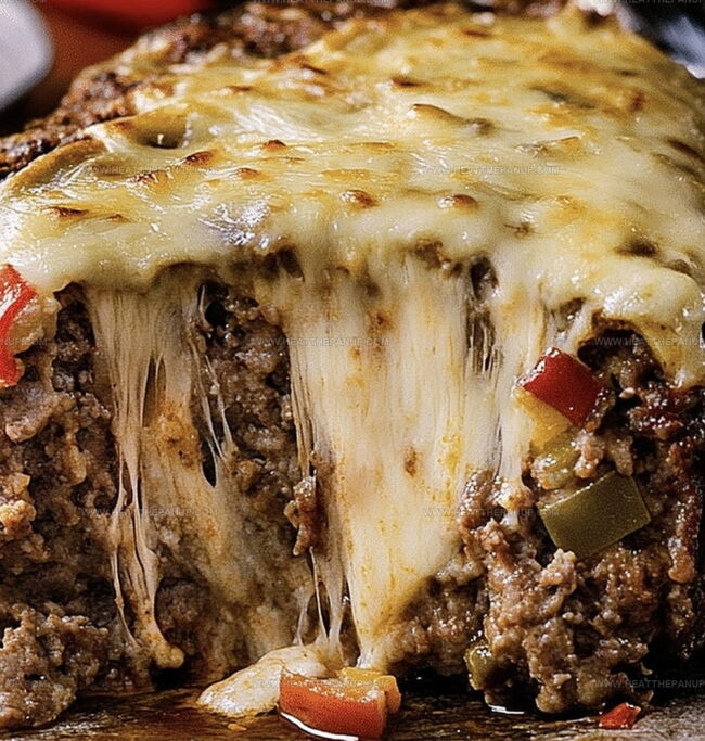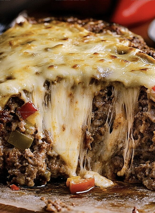 - Slice and serve hot, revealing the melted cheese and vibrant vegetable-studded interior of this Philly Cheesesteak-inspired meatloaf.