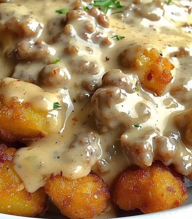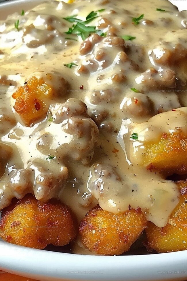 Each bite combines the crunch of tater tots with the smooth, peppery warmth of homemade gravy.