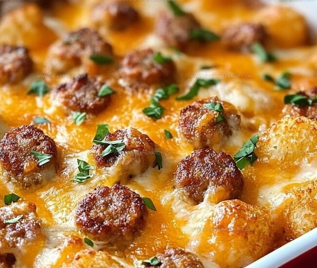 Hearty layers of golden tater tots nestle between perfectly seasoned breakfast sausage, creating a breakfast dream.