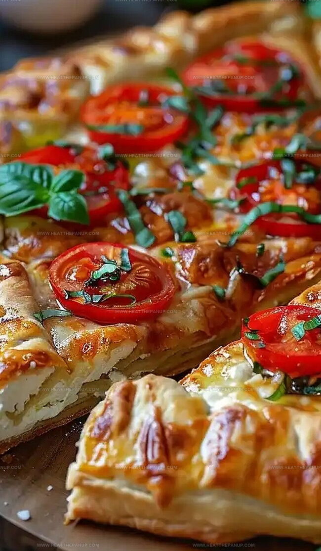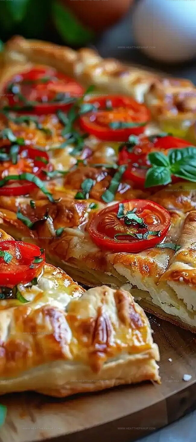 Flaky pastry cradles ripe garden tomatoes with creamy cheese.