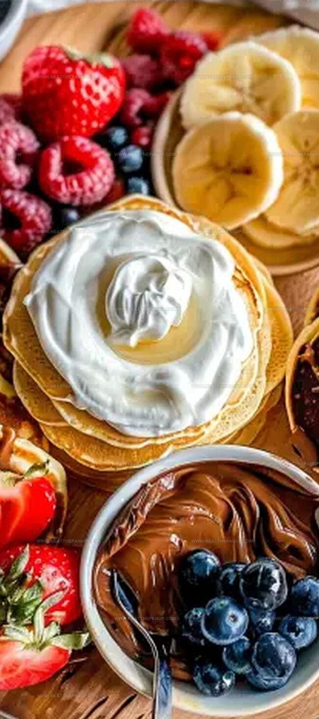 Mornings become an interactive culinary adventure when you spread colorful toppings and fluffy pancakes across a rustic wooden surface.
