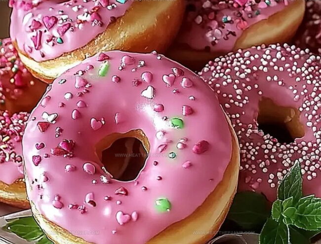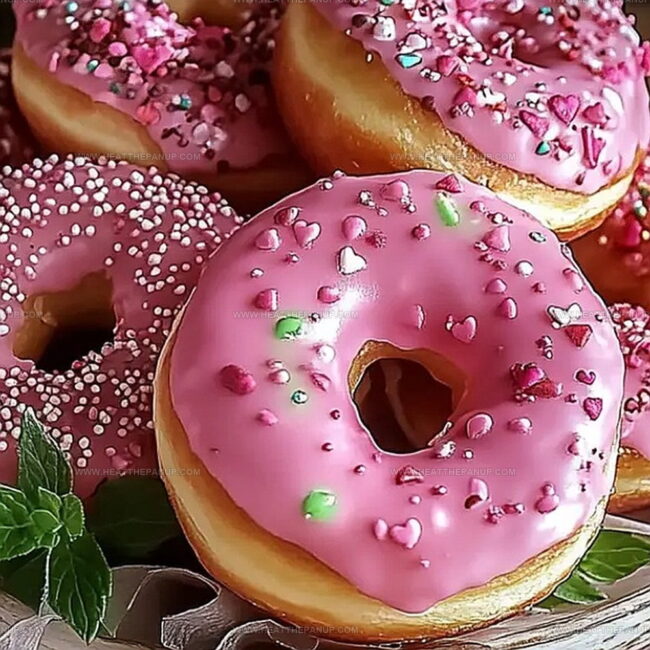 - Immerse donut tops into the prepared glaze, allowing excess to cascade downward. Embellish immediately with festive Valentine’s-themed sprinkles and shimmering edible glitter.
