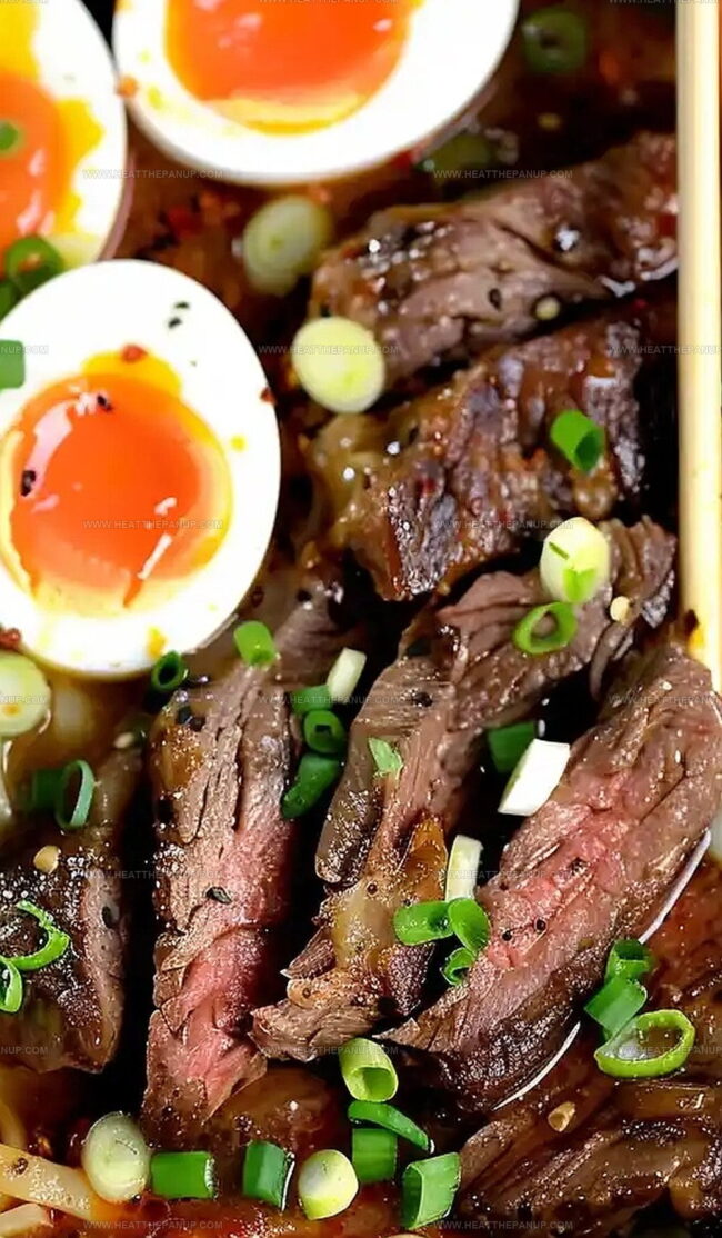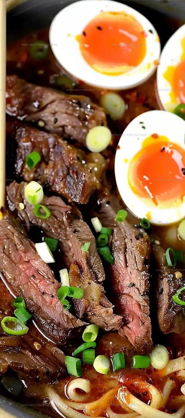 Layer shredded beef generously over cooked noodles. Pour steaming hot broth directly over meat and noodles. Carefully place two egg halves on top of each bowl. Sprinkle freshly chopped green onions as a vibrant finishing touch.